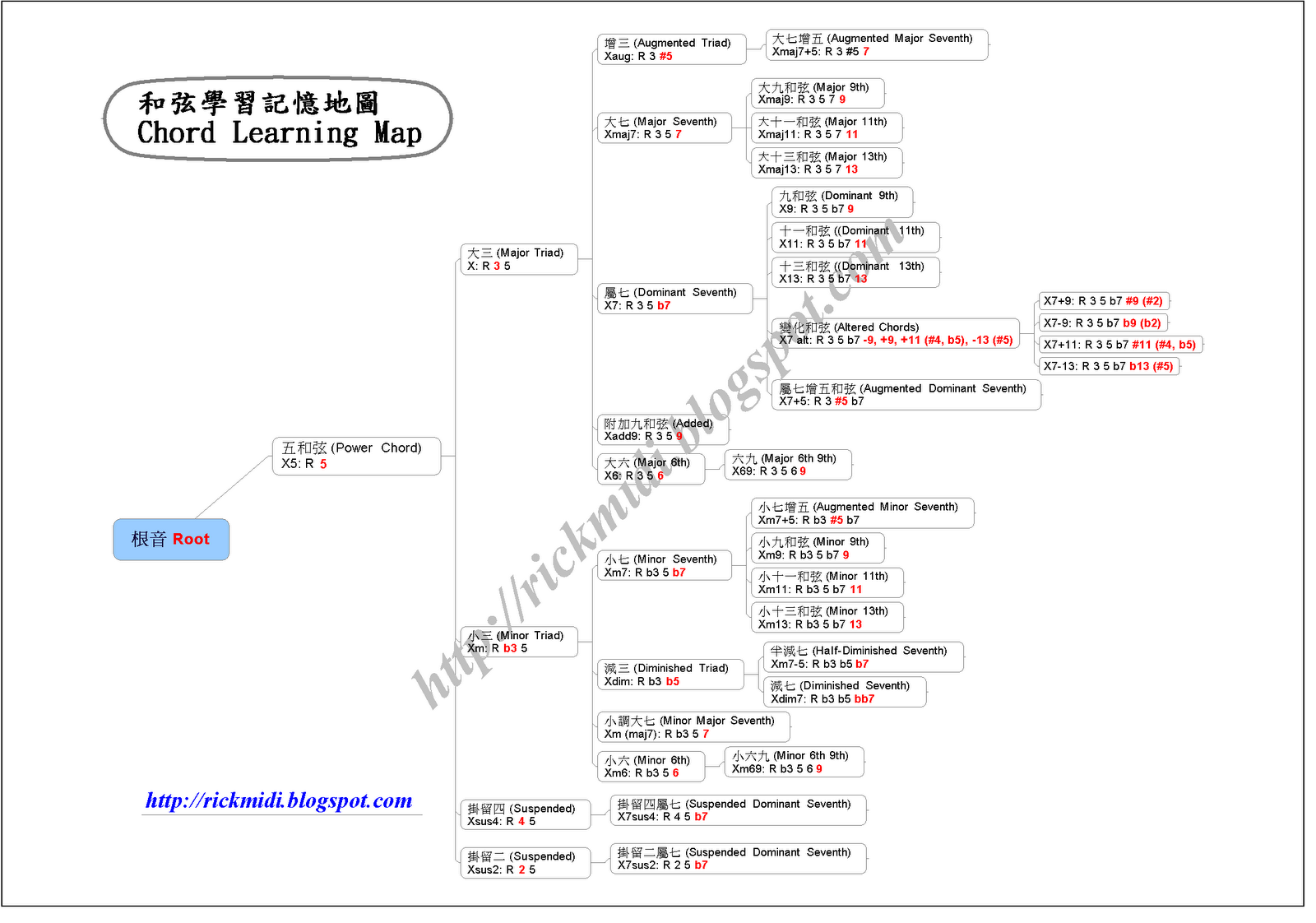 下圖是我個人在記憶、推算和弦時的地圖。記憶的方式就是循序漸進,一次只增加或變化一個音,慢慢推演。這個好處就是著於學習者能夠很清楚的理解每一個和弦的由來以及聲響的差異,對於之後學習 Shell Chords、推算 Extended Chords、Altered Chords、或者練習 Arpeggios 時,都有不錯的幫助。