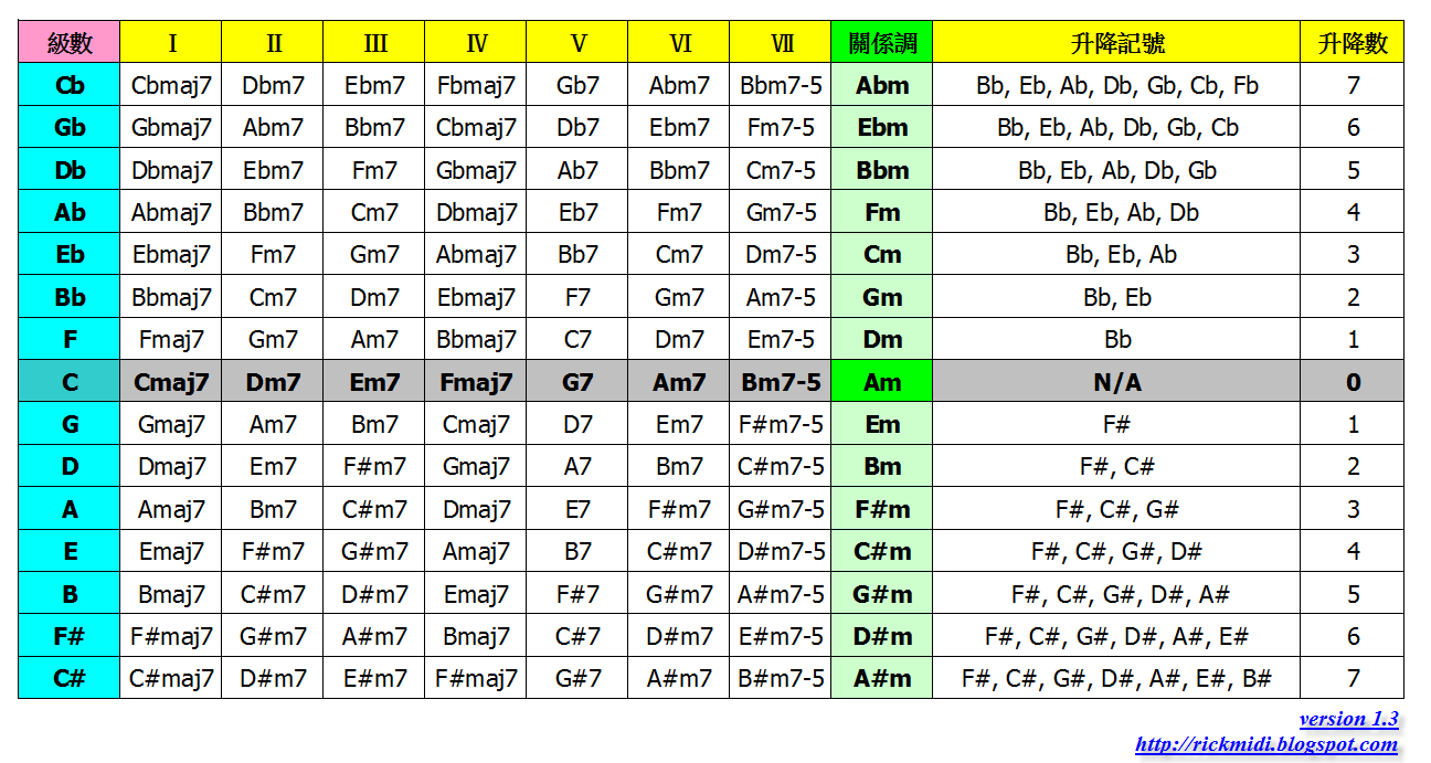 表格中,只要是由上網下的關係都是五度,例如 縱向的 Ⅲ 級 Fm7 -> Cm7 => I -> Ⅴ of Fm;而由下往上都是四度關係。另外右邊的升降記號也可以發現,升降記號的次序也是跟五度圈有關係,同樣可以藉由五度圈的排列次序來協助記憶有那些[升降記號][rm4]。