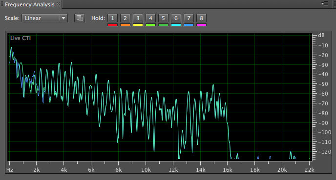 頻率分析就是根據『樂器音階頻率表』的定義,分析出目前的音是哪一個。不過必須仰賴數學方法來分析,以 CD 音質 44.1 kHz / 16bit 的規格,每秒的資料有 44.1k 筆,在分析上每秒會同時有很多頻率 (如下圖),要分析出有哪一些音以及他們的比率關係,辨識出音符。