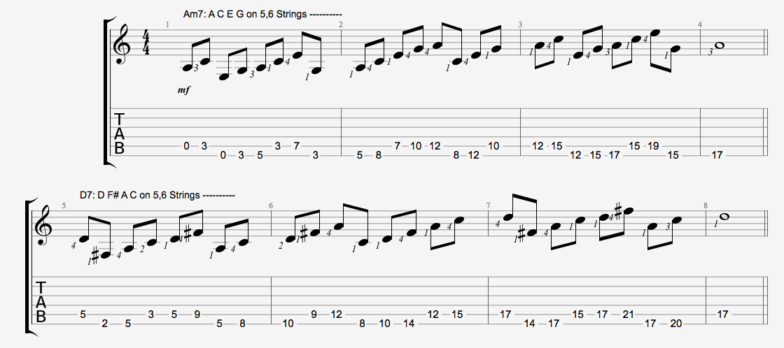 同樣的是在兩根弦上練習,下圖是 Am7、D7 在五、六弦上的練習。這次我把六線譜顯示出來了,不過練習過程中,還是要思考音符為主。用 腦袋驅動手指頭,用音符表現音樂。