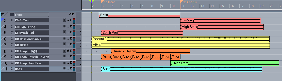 爲了節省說明時間, 我製作的這段是從歌曲的間奏開始, 之後接歌曲的副歌. 這段主要有 Loop 有三段, 其中的兩段 (Reverb Rhythm, 三角鐵) 因為時間重疊, 所以最後我把他們輸出成同一組: