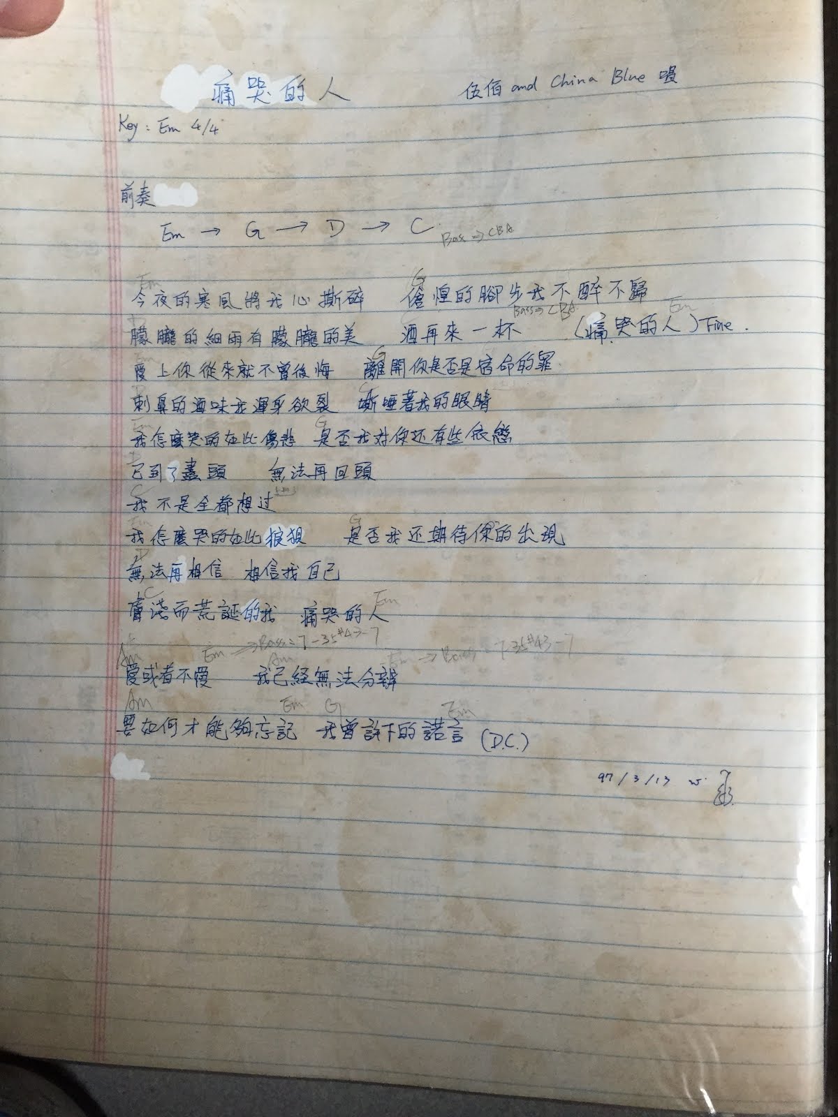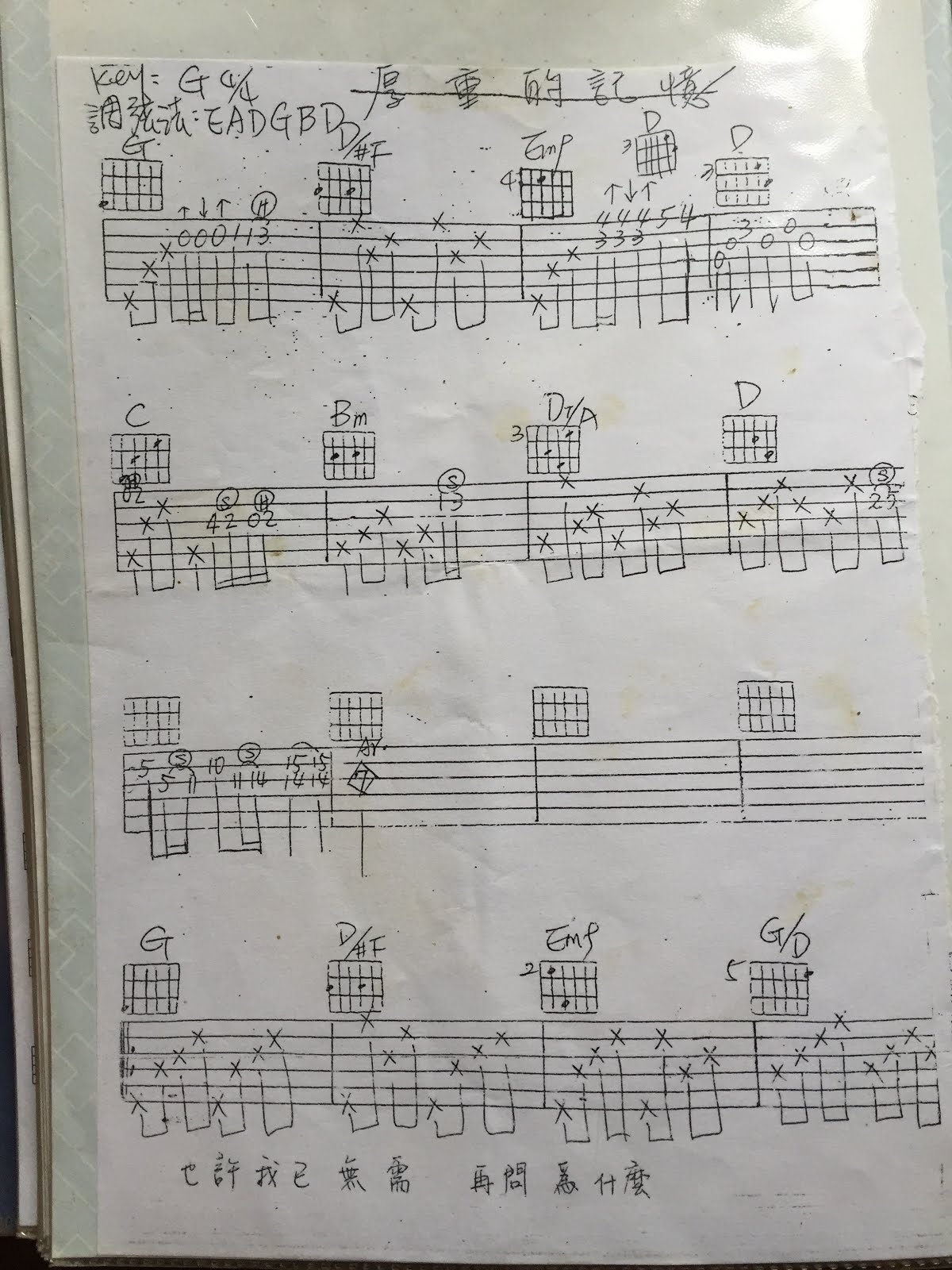 這首 厚重的記憶 不知道哪一張專輯 B 面最後一首,一把吉他伴奏而已。很喜歡這首曲子的詞,後來透過同學凹到一手的譜,不過他需要調弦,我很懶就自己改成不要調的 XD