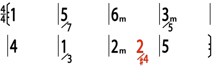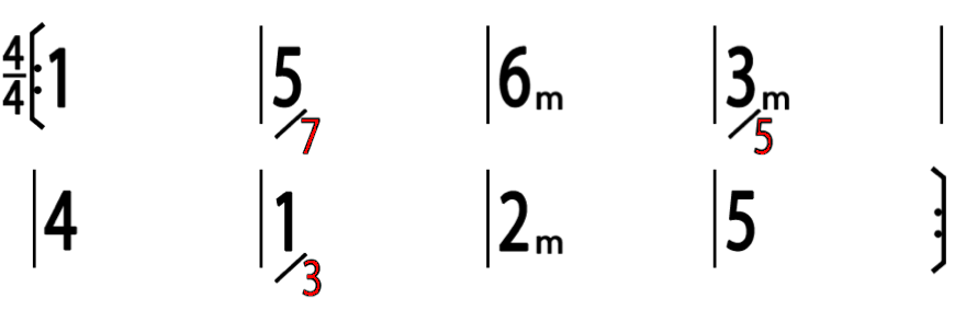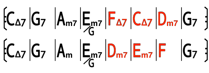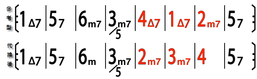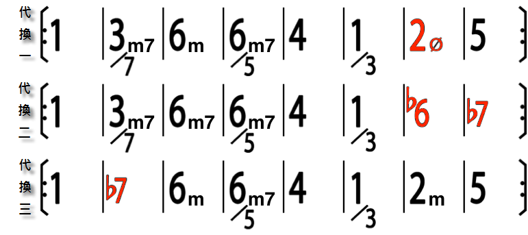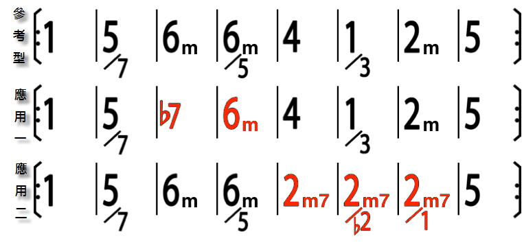 這可以換的就很多了,這裡舉的例子是最常見的,後四小節本來聽起來是降冪的,變成升冪的感覺. 其中 2m 代 4,3m7 代 1M7,4 代 2m 應該不難理解.