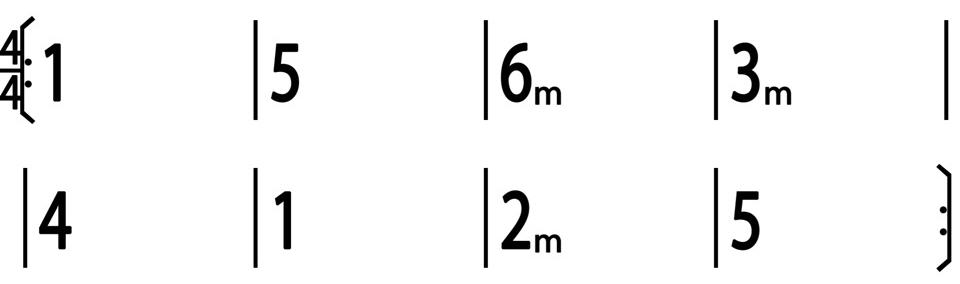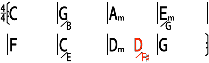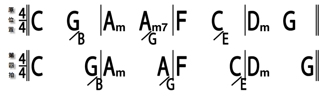 我們提到這個基本形的時候,並沒有特別去強調和弦的位置和拍子的關係,但是當同樣的組合,當每小節有兩個和弦時 (通常是慢歌),我們做一個拍子上的位置變化,改成如下: