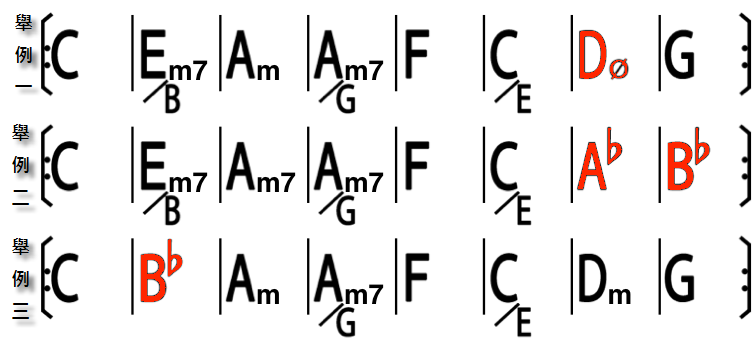 例二、三都是直接改編和弦進行的方式,原則就是直接藉用小調的和弦進行. 這兩個例子在流行歌曲裡面都是很好用的編曲技巧.