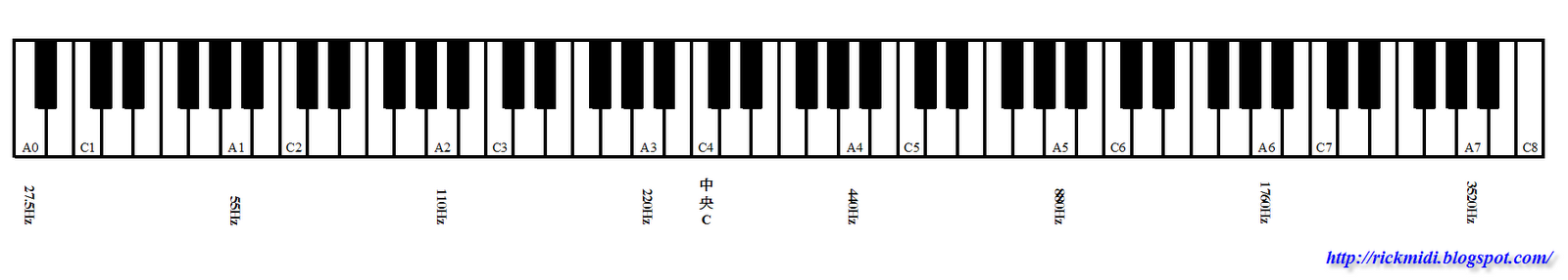 中央 C 定義為 C4,也就是鍵盤上第四個 C。音階在鋼琴 (鍵盤) 上,左到右是由低到高,12 個半音 (八度) 一直循環。一架 88 鍵的鋼琴共有 7 個完整的八度。如下圖: